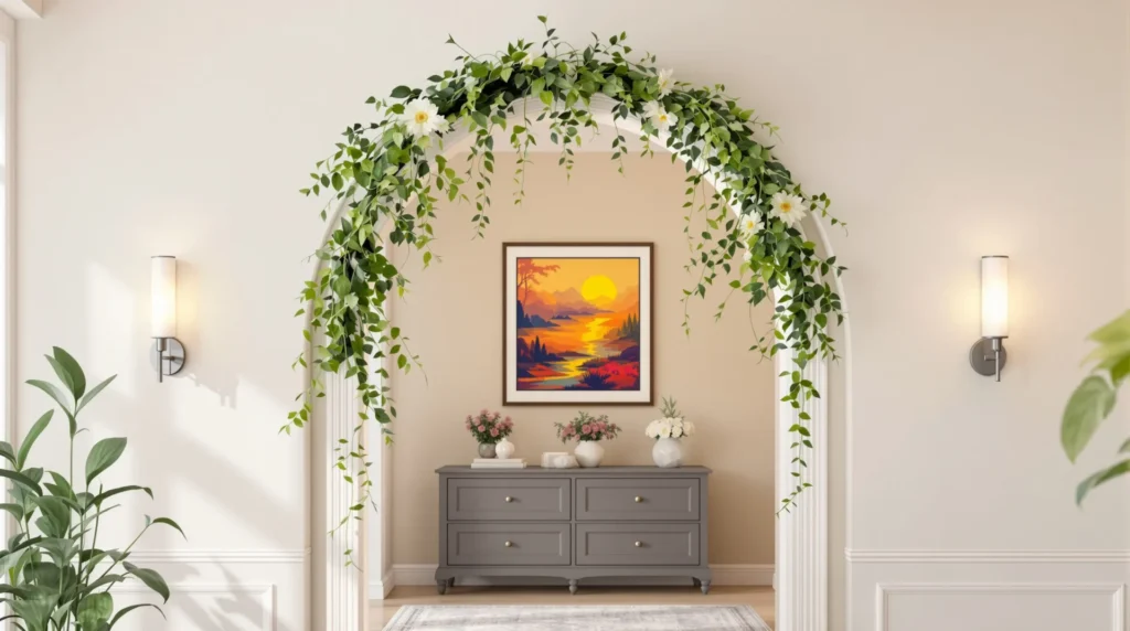 Here’s what most people miss: plants add movement and texture, making your archway feel alive.