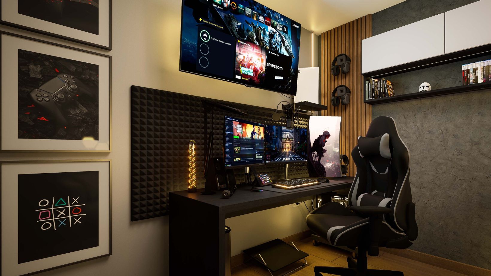 For serious gamers, a high-tech gaming room is essential. This setup includes: